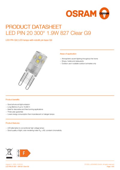 LED PIN 20 300° 1.9W 827 Clear G9 | G9 | 1.9 W | 220…240 V | 15000 h | 200 lm | 20 W | 300 ° | No |